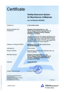 公司嚴(yán)格按ISO9001:2015《質(zhì)量管理體系—要求》、ISO14001:2015《環(huán)境管理體系 要求及使用指南》、ISO 45001:2018《職業(yè)健康管理體系 要求及使用指南》和TSG 07—2019《特種設(shè)備生產(chǎn)和充裝單位許可規(guī)則》,建立完善的管理體系。公司擁有國內(nèi)較大的12000KN冷拔機(jī)組和先進(jìn)的全溫控不銹鋼固溶退火爐等生產(chǎn)設(shè)備,同時具有ET16-159渦流探傷儀、UT16-159超聲波探傷儀、UT159-830超聲波探傷儀、H159-630水壓試驗(yàn)機(jī)、WAD—600液壓材料試驗(yàn)機(jī)、4XB電腦金相顯微鏡、JQ—300沖擊試驗(yàn)機(jī)、HBRVU—187.5硬度計、島津光譜儀、化學(xué)分析儀、晶間腐蝕試驗(yàn)等完善的檢測設(shè)備。